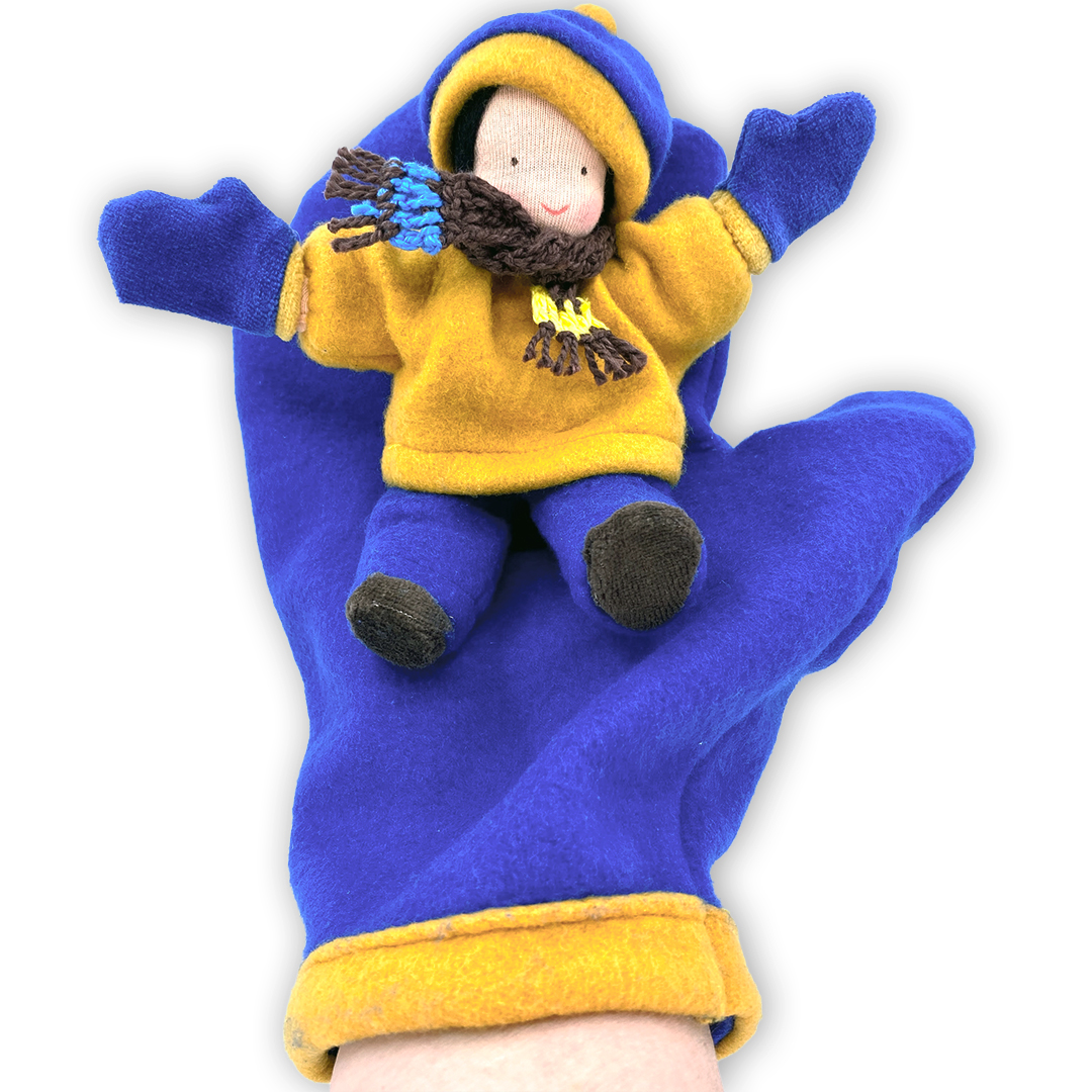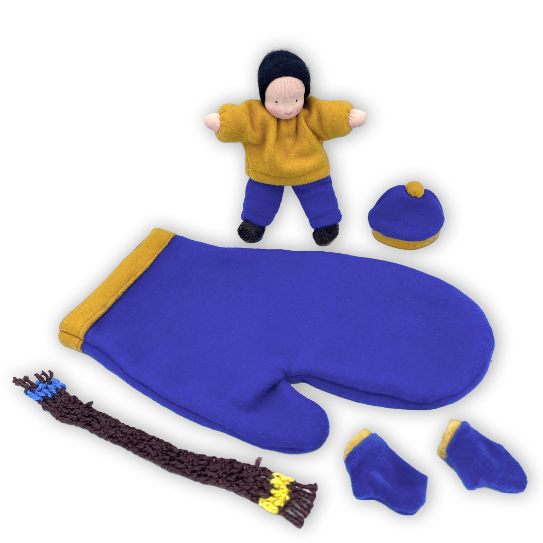 Dukkemann med lue, genser, bukse, skjerf, to små votter og en stor vott.