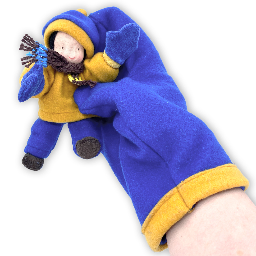 INNHOLD FantaSIboka mi. Dukkemann, lue, heklet skjerf, to små votter og en stor vott. Fargene er holdt i blått og gult for å vise at folkeeventyret har sin geografiske opprinnelse i Ukraina.