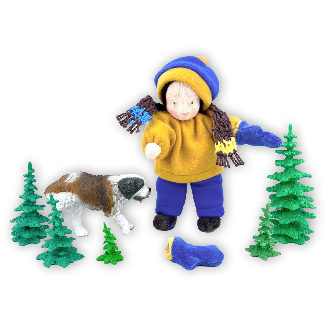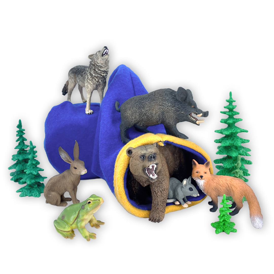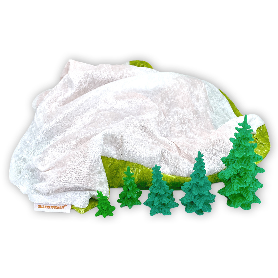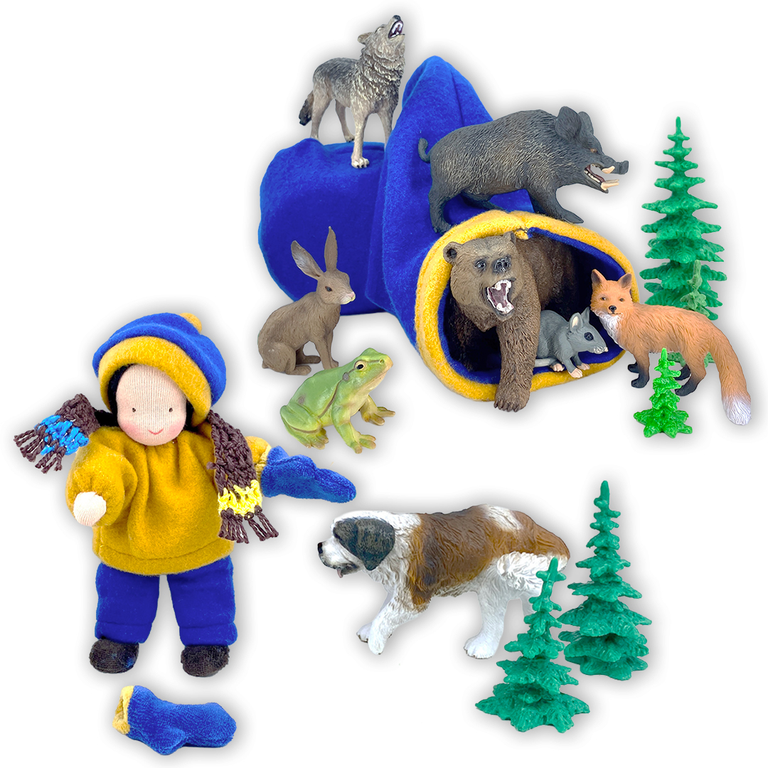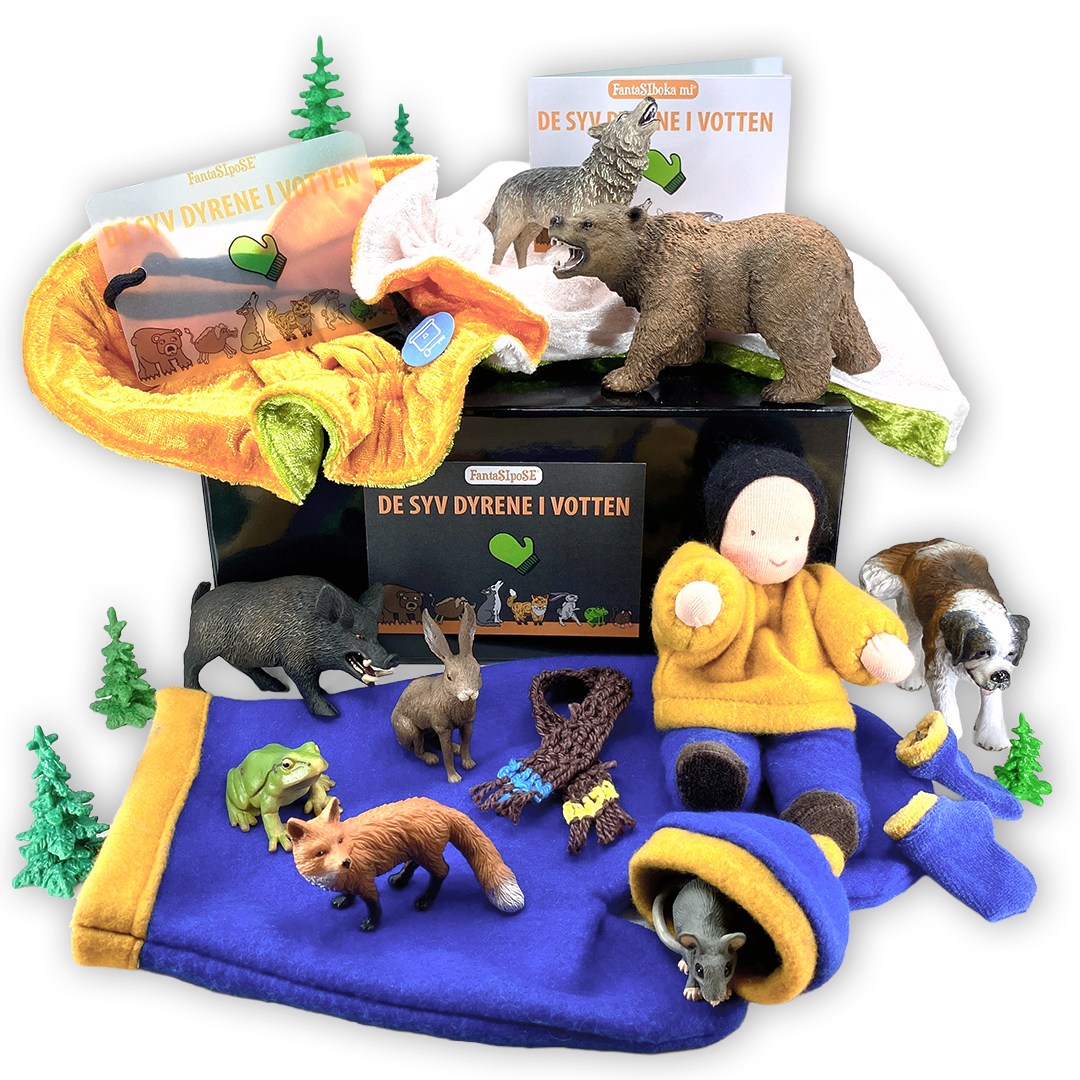 INNHOLD Nyhet i april 2026: Sett med bevegelig dukkemann, skjerf (heklet), votter, lue og stor vott. Settet er vårt eget design i det ukrainske flaggets farger, håndlaget av vår samarbeidspartner Evi i Sao Paulo, Brasil. Granskog med plasttrær. Plastdyr: Mus, frosk, hare, rev, ulv, villsvin, bjørn og hund. Svart boks med magnetlukking, FantaSIboka mi og FantaSIpoSE-posen.
