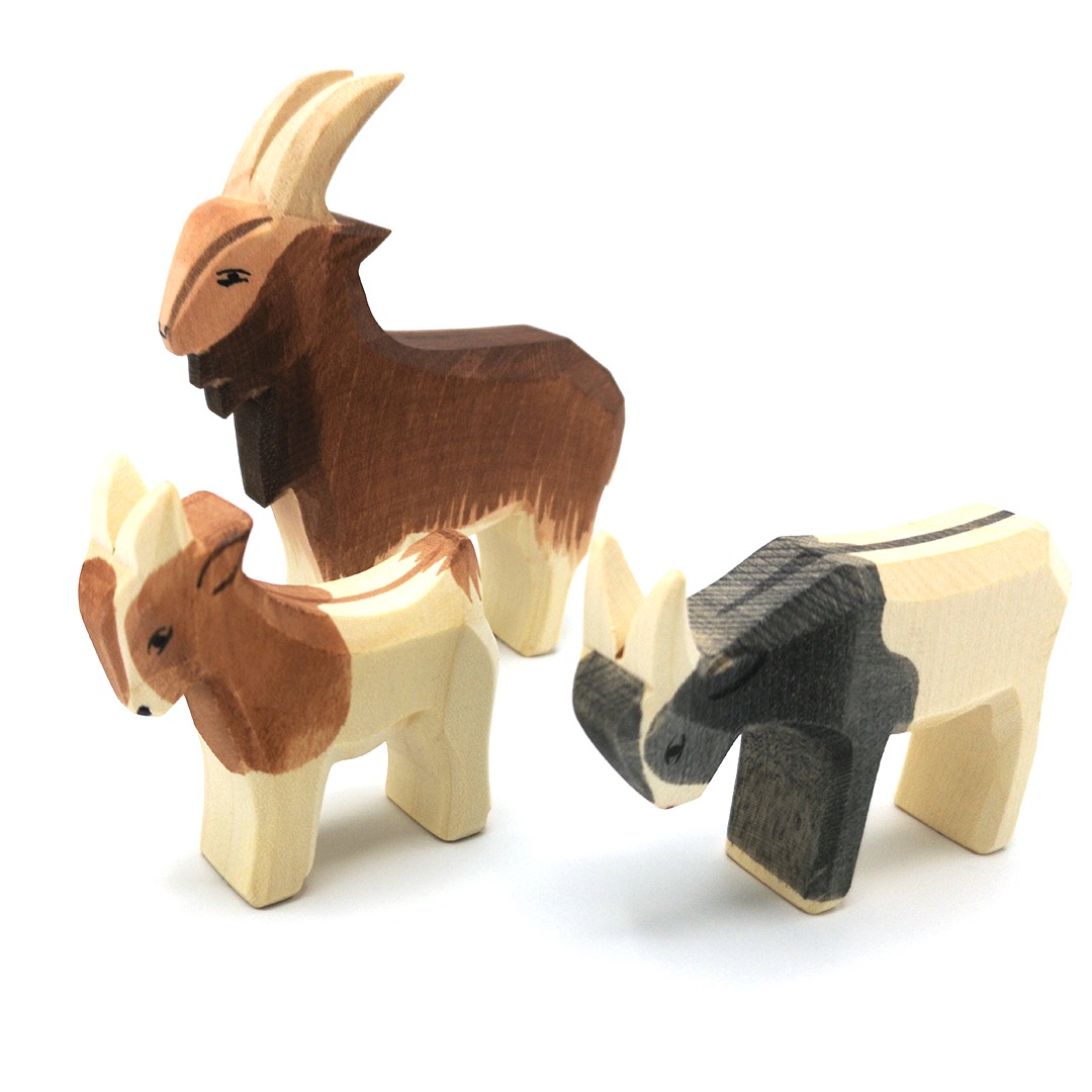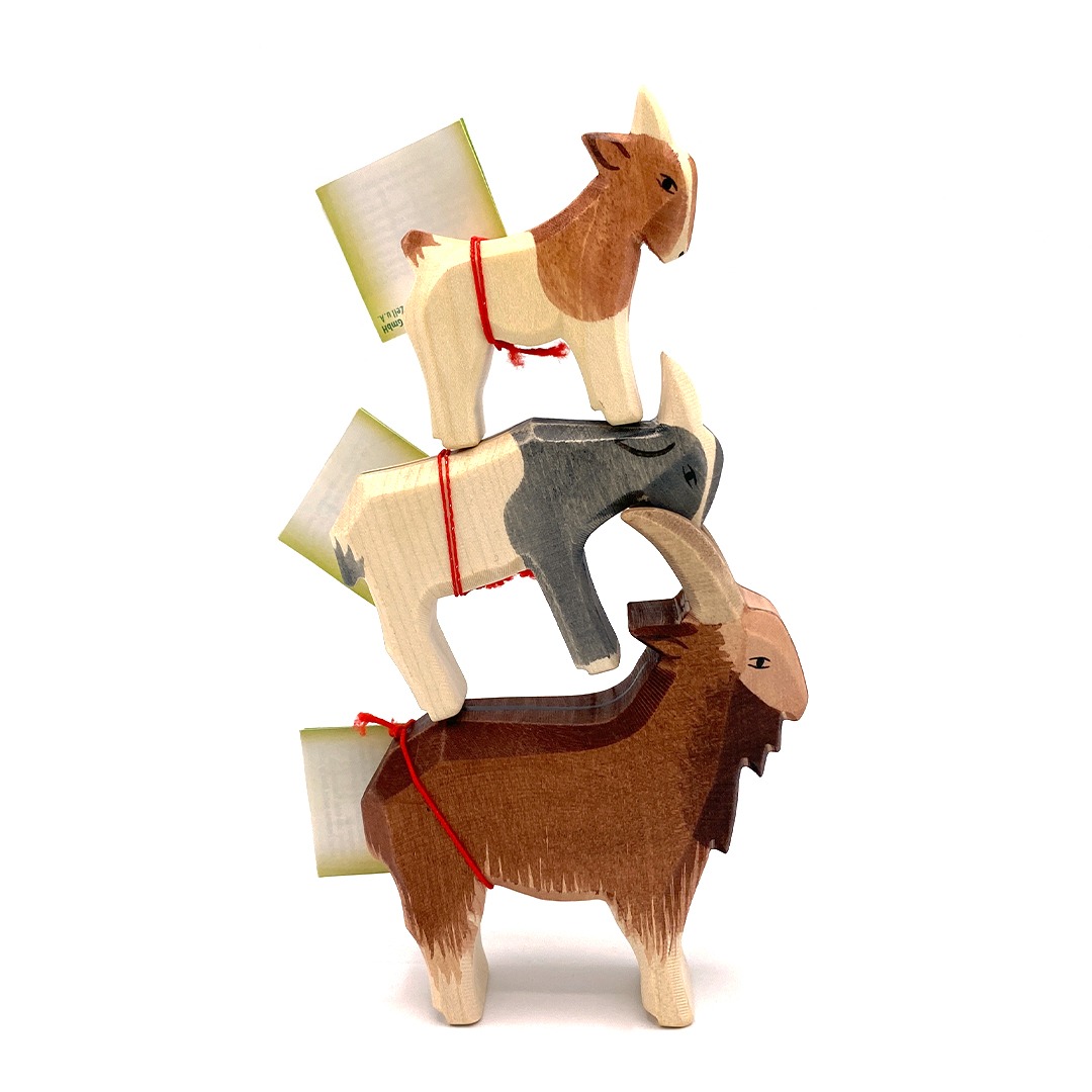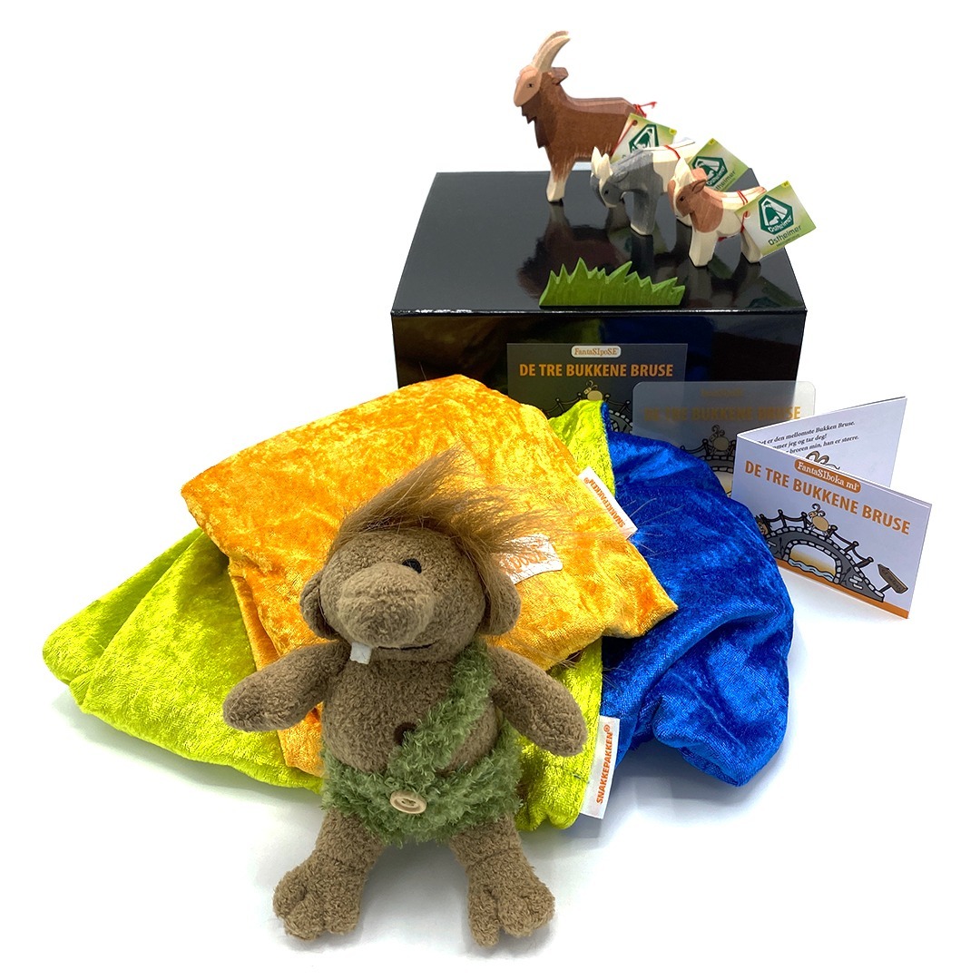 Tre geiter fra Ostheimer i ulik størrelse, troll, gress og bru i tynn trefinér. Svart boks med magnetlukking, FantaSIboka mi og FantaSIpoSE-posen.