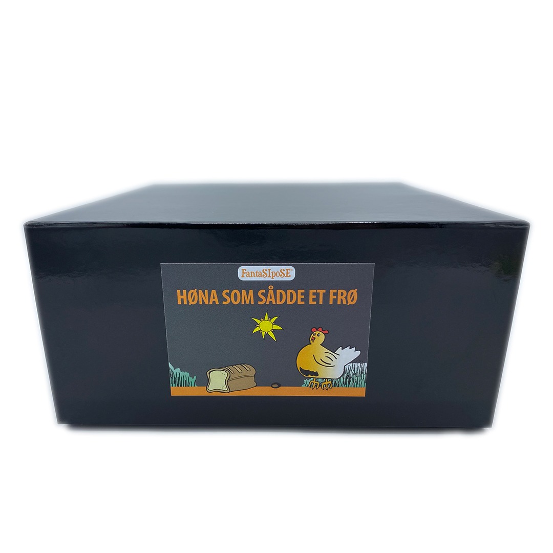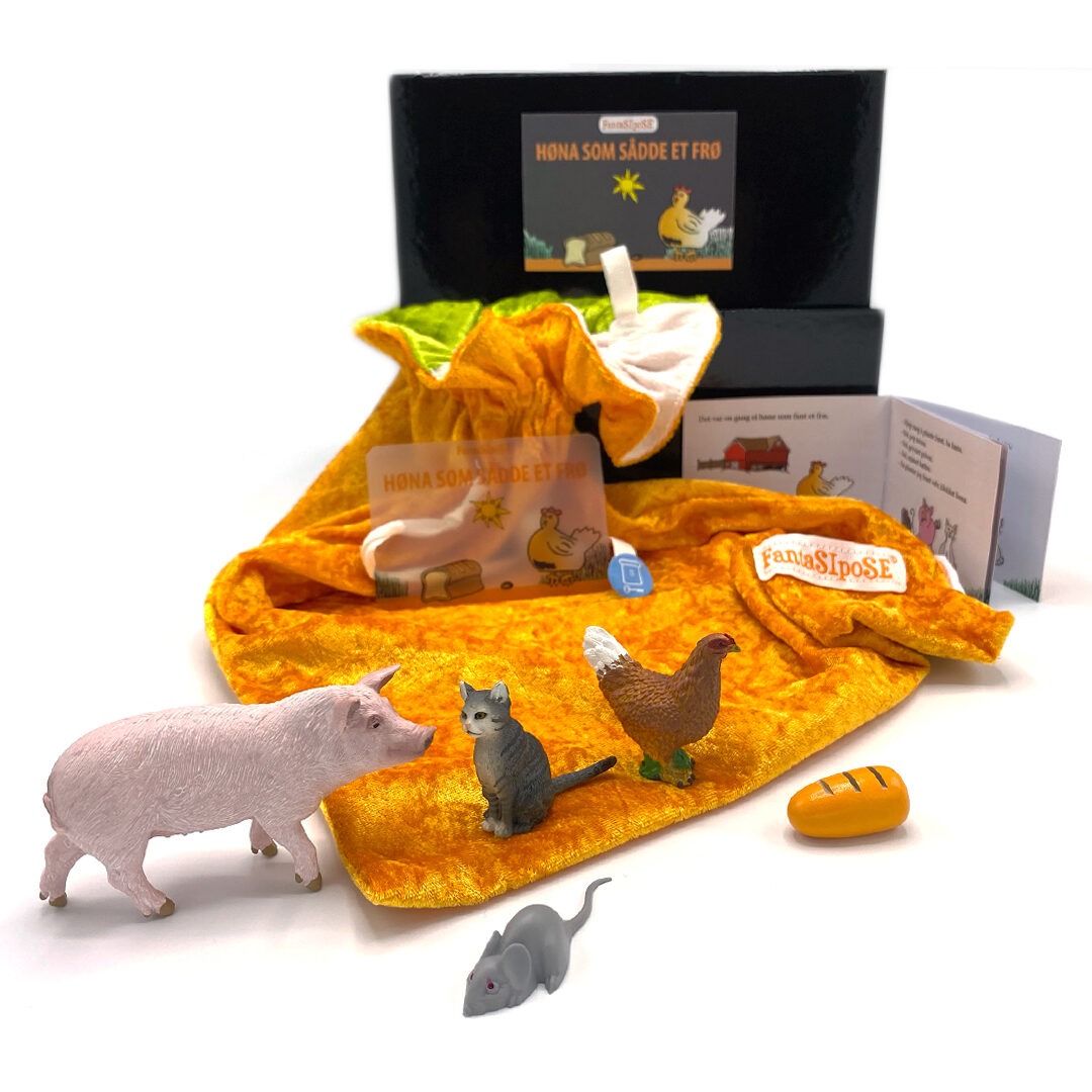 Høne, mus, gris, katt og brød. Svart boks med magnetlukking, FantaSIboka mi og FantaSIpoSE-posen.