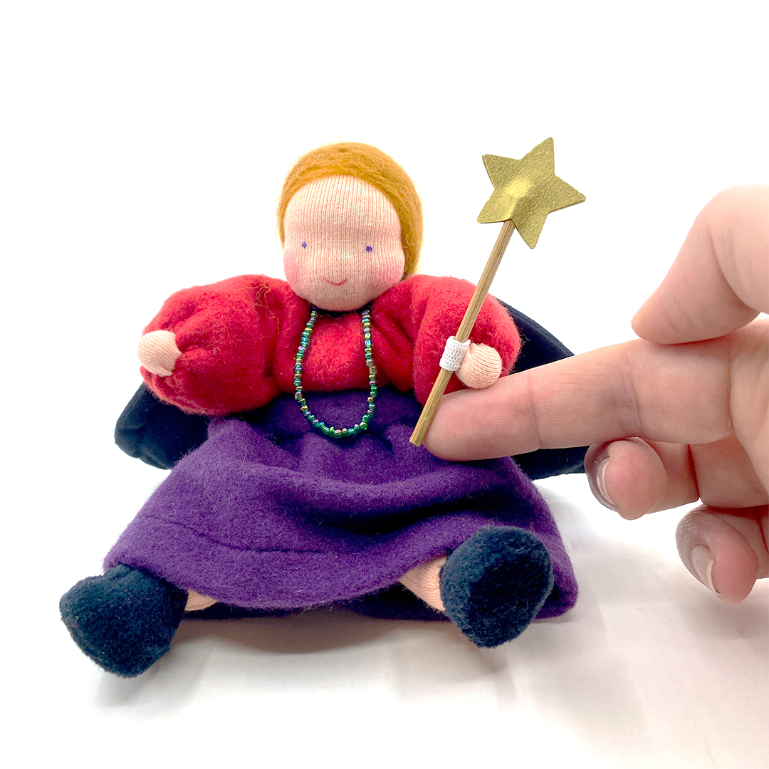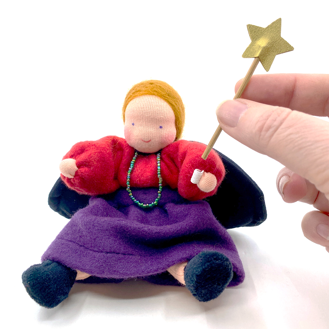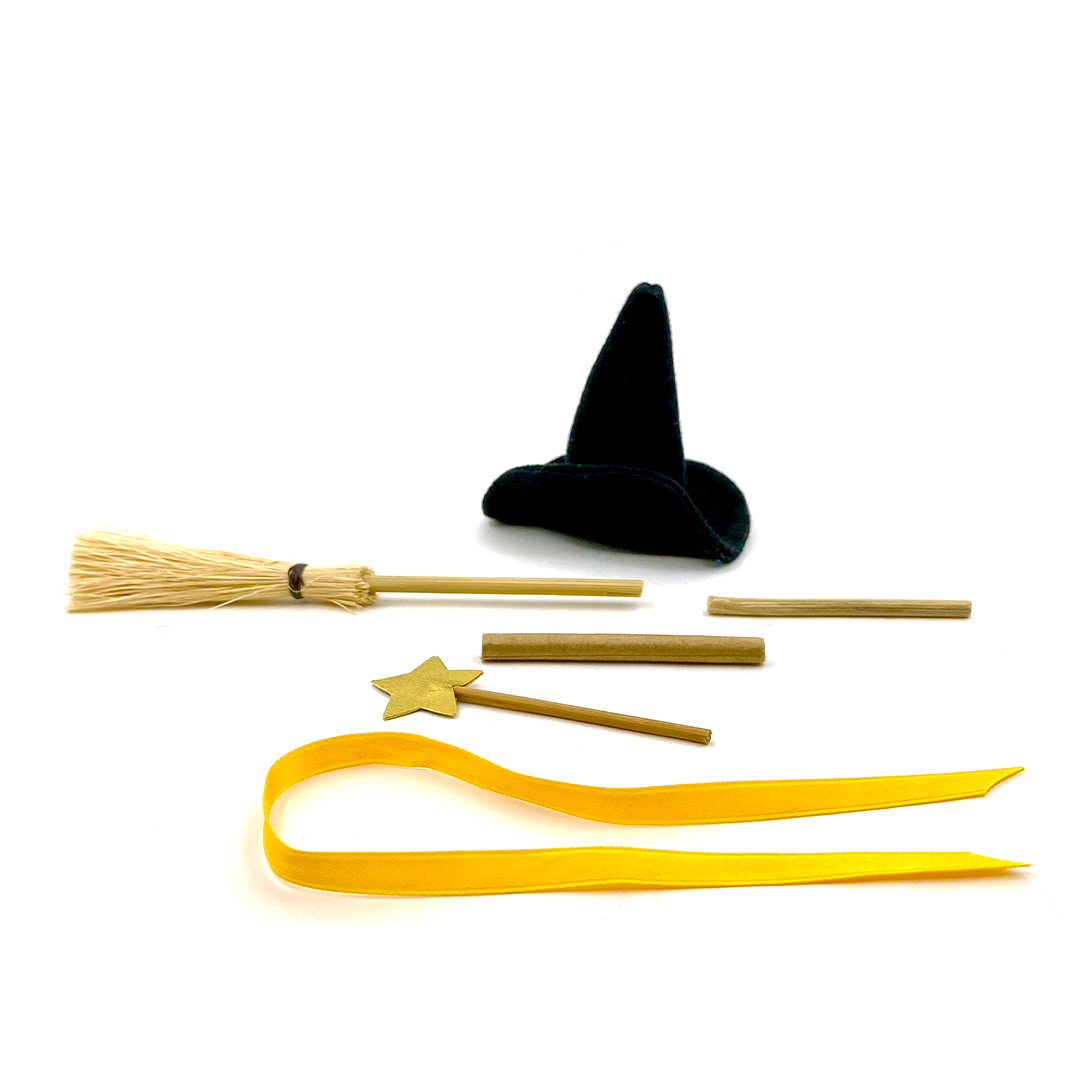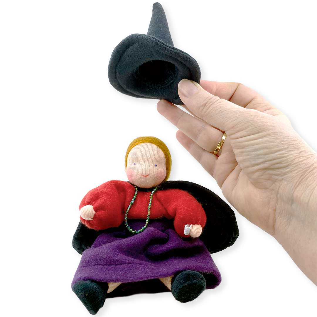 Heksedukke-sett: Bøybar dukke med bluse, skjørt og kappe. Avtagbar hatt. Perlekjede i grønntoner. Elastisk hånd-hempe til tryllestaven. Modellen er tilpasset og skreddersydd for oss av vår gode samarbeidspartner Atelier de Bonecas Evi, et dukkemakeri i Sao Paulo, Brasil.
