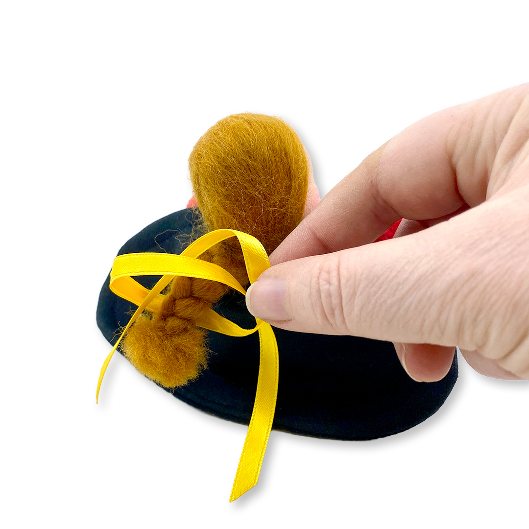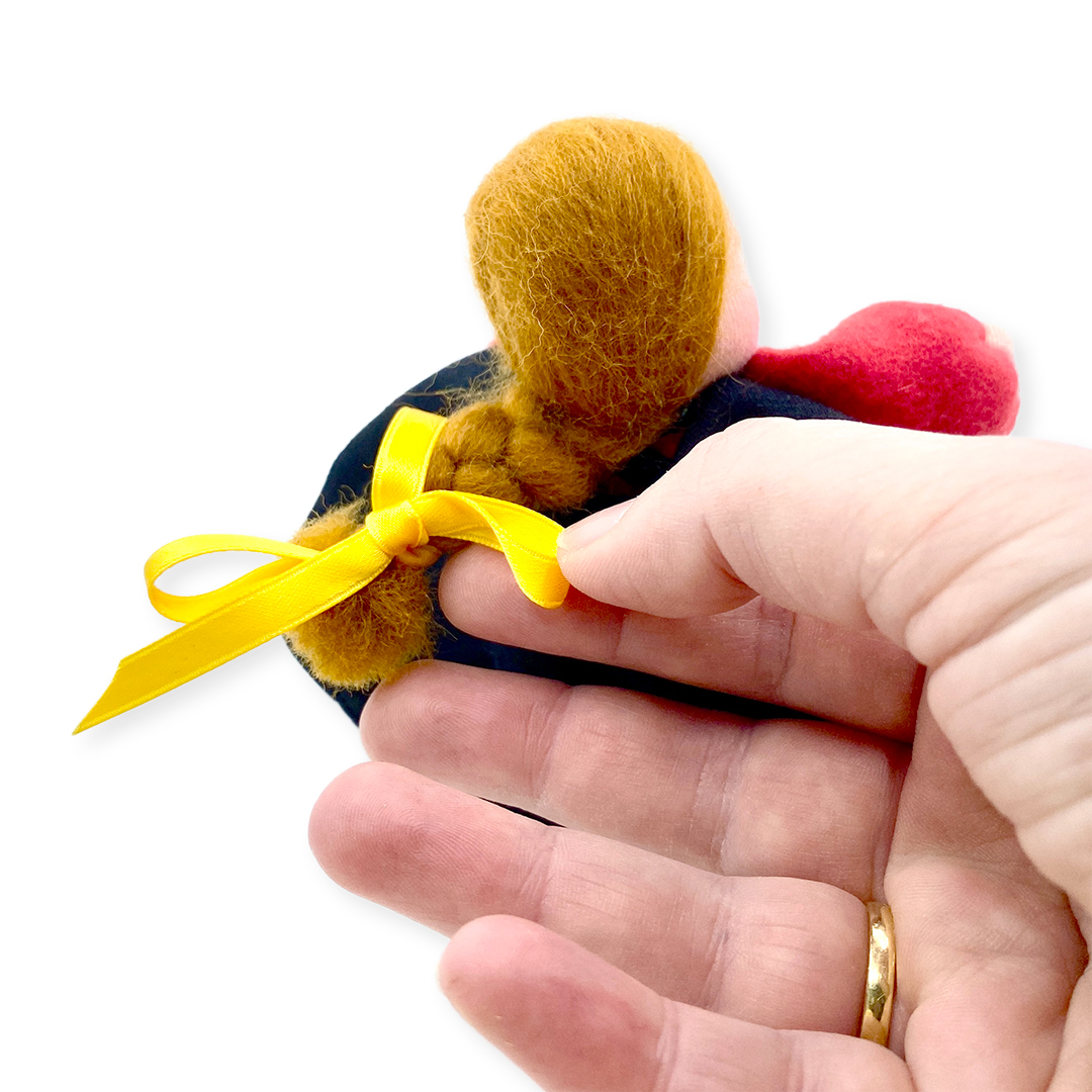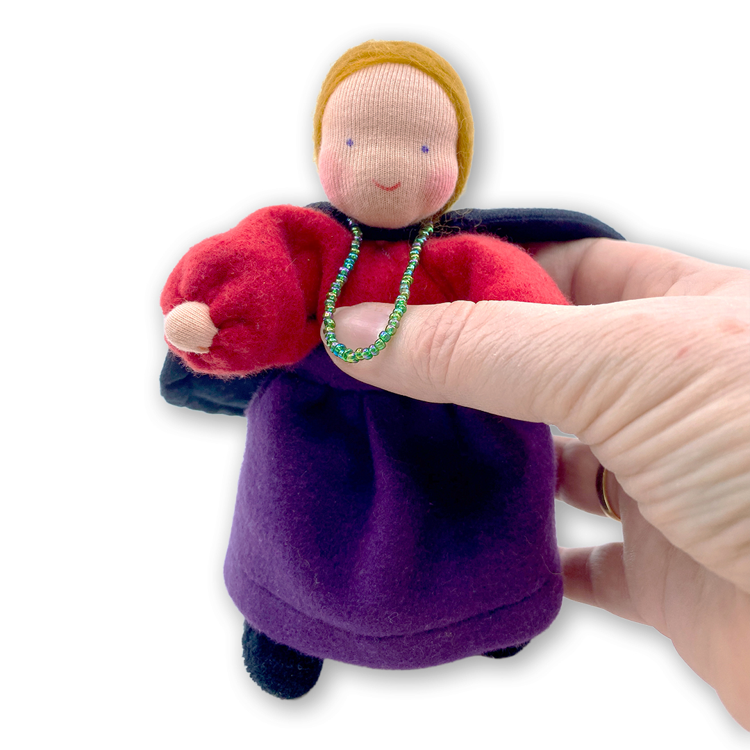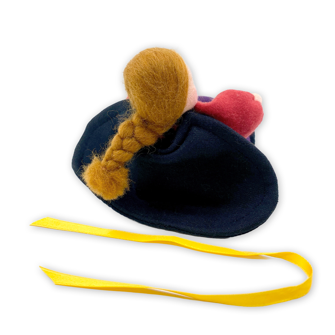 Heksedukke-sett: Bøybar dukke med bluse, skjørt og kappe. Avtagbar hatt. Perlekjede i grønntoner. Elastisk hånd-hempe til tryllestaven. Modellen er tilpasset og skreddersydd for oss av vår gode samarbeidspartner Atelier de Bonecas Evi, et dukkemakeri i Sao Paulo, Brasil.
