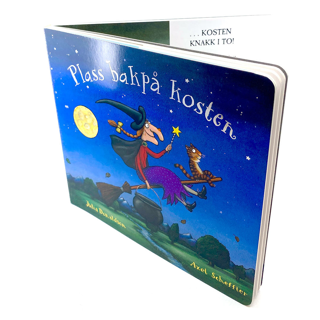 Barnebok: Forfatter: Julia Donaldson. Illustrasjoner: Axel Scheffler. Norsk oversettelse: Arne Ruste. Tykke sider som også de aller yngste kan bla i. Bredde 18,5 cm. Høyde 16,5 cm. Tykkelse 1,3 cm.