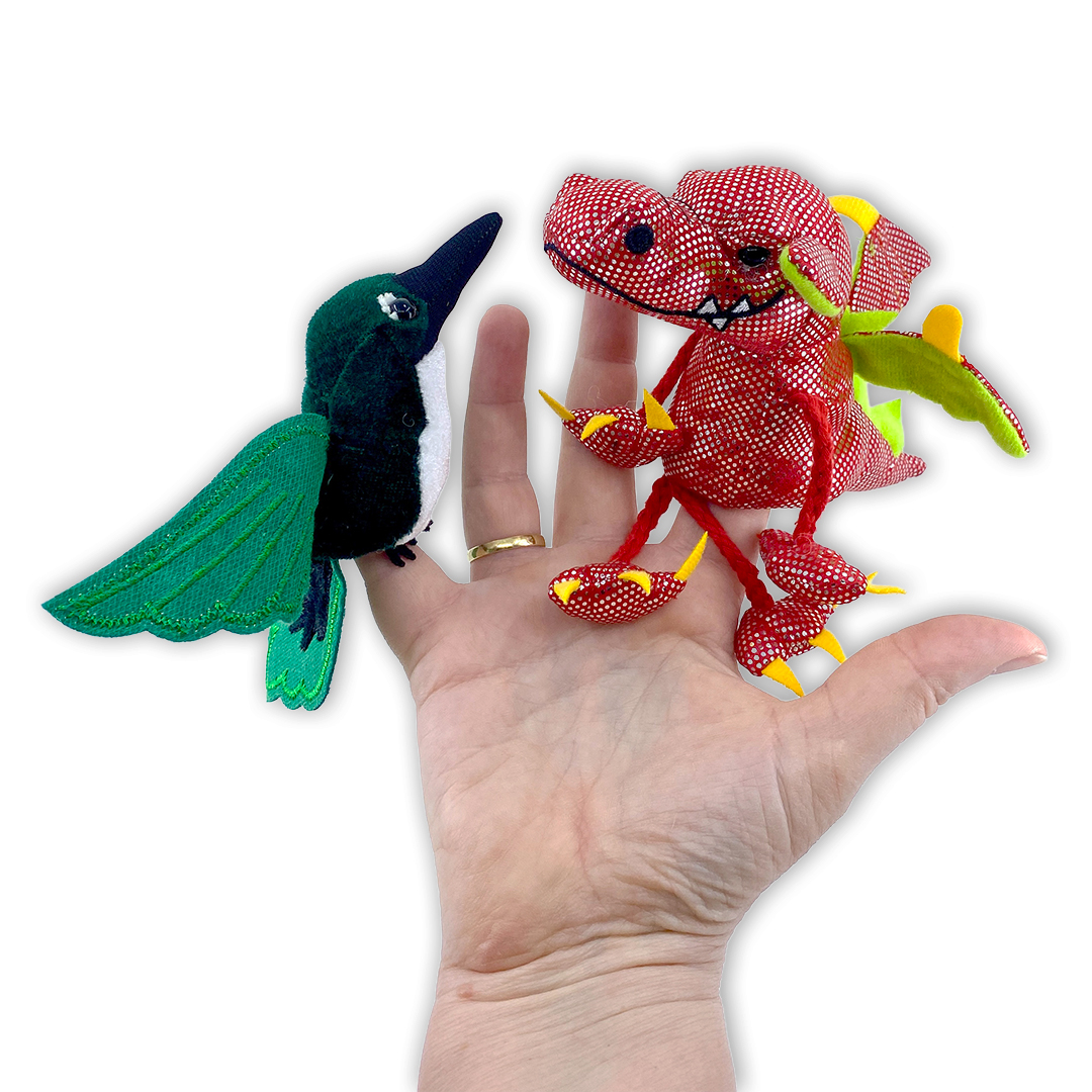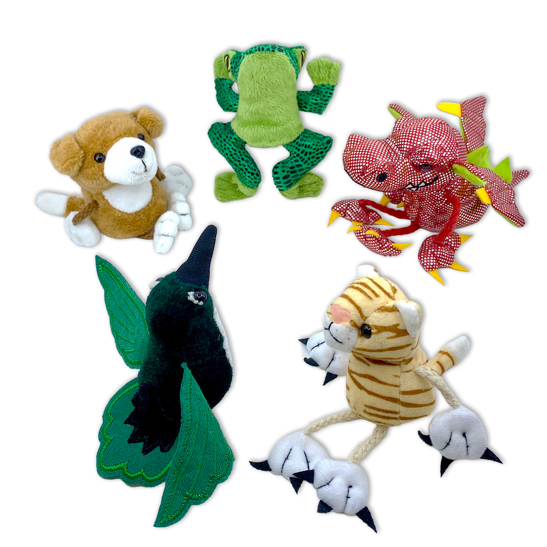 Fingerdukker i plysj: Katt, hund, frosk, fugl og drage. CE 12 måneder.